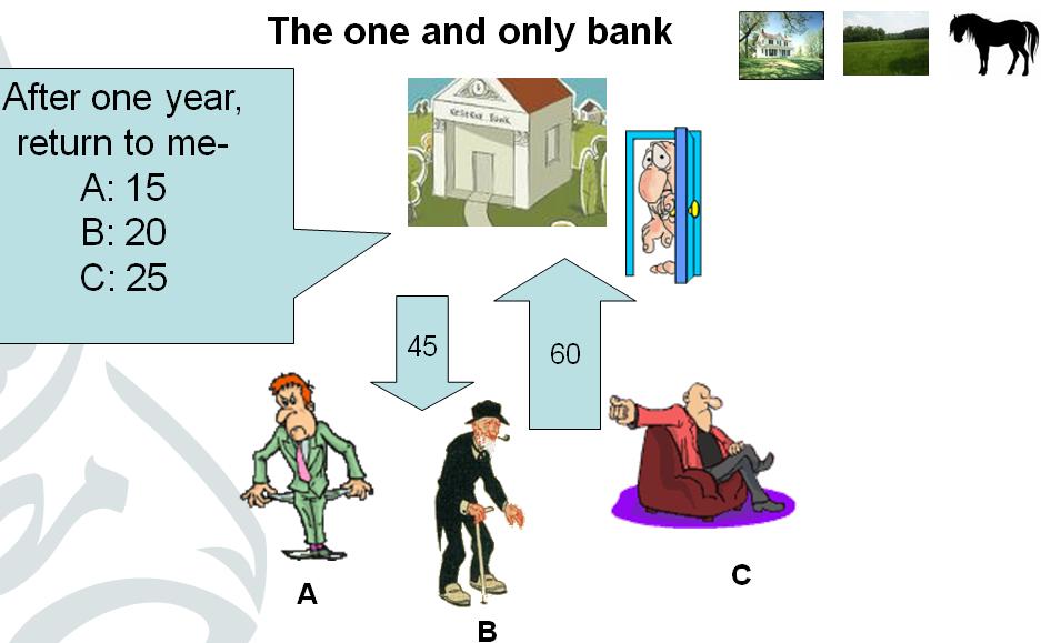 All three go back home to live happily ever after without knowing the sinister trick that has been played. The ONLY BANK has issued USD 45 and is asking for USD 60 at the end of the year. This extra USD 15 doesn’t exist in the economy since it has not been created/printed/released yet (remember point 1 and that ONLY BANK is executing its first lending cycle).