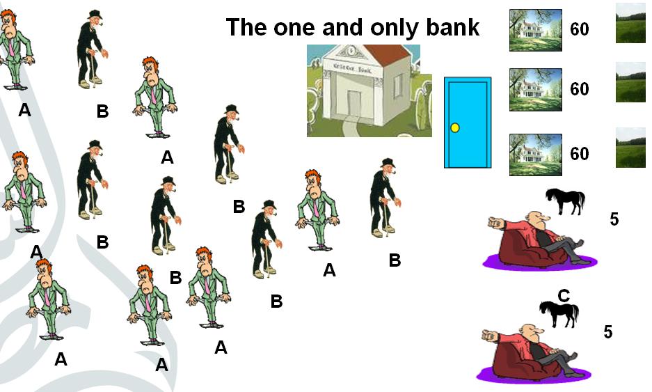 There are three prospective customers. Mr. A who wants USD 10. Mr. B who wants USD 15 and Mr. C who wants USD 20. They have a house, land and farm animals respectively to provide as collateral.